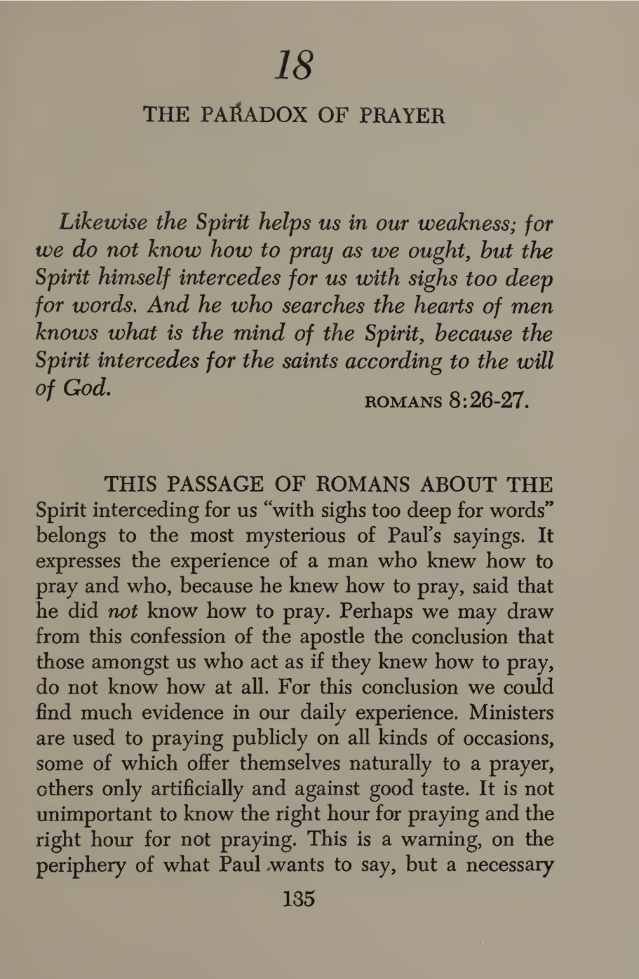 Wychodząc z tego wglądu, Paweł daje tajemnicze rozwiązanie kwestii właściwej modlitwy: to sam Bóg modli się przez nas, gdy modlimy się do Niego. Sam Bóg w nas – to właśnie znaczy Duch. Duch to inne określenie „Boga obecnego”, poruszającego, inspirującego, przemieniającego. Coś w nas, co nie jest nami samymi, wstawia się przed Bogiem za nami. Nie możemy zasypać przepaści między Bogiem a nami, choćby najbardziej intensywnymi i najczęstszymi modlitwami; przepaść między Bogiem a nami może zostać przekroczona jedynie przez Boga. I tak Paweł daje nam zaskakujący obraz Boga wstawiającego się za nami przed samym Sobą. Takie symbole — jak wszystkie symbole dotyczące Boga — są absurdalne, jeśli rozumie się je dosłownie. Są głębokie, jeśli przyjmuje się je jako autentyczne symbole. Symbol Boga wstawiającego się przed samym Sobą za nami mówi, że Bóg wie o nas więcej niż to, z czego jesteśmy świadomi. On „bada serca ludzi”. Są to słowa antycypujące współczesny wgląd, z którego słusznie jesteśmy dumni, że małe światło świadomości wznosi się na rozległej podstawie nieświadomych popędów i obrazów. Jeśli tak jest, któż inny może przynieść całe nasze bycie przed Boga, jeśli nie sam Bóg, który jedynie zna głębokości naszej duszy?